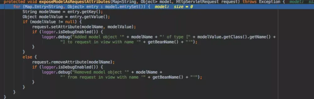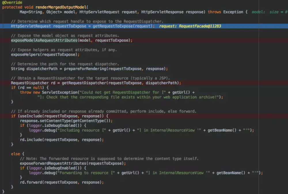 针对jsp格式的视图,我们配置的view是org.springframework.web.servlet.view.JstlView,渲染过程就是将model中的值set到request的attribute中,之后就是使用jsp自己的规则来显示jsp文件就好。