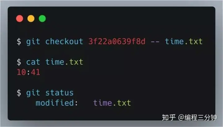 checkout+commit id+-- filename的组合,横跨版本2把历史版本3的time.txt搞出来了 - 查看状态,time.txt被改变了