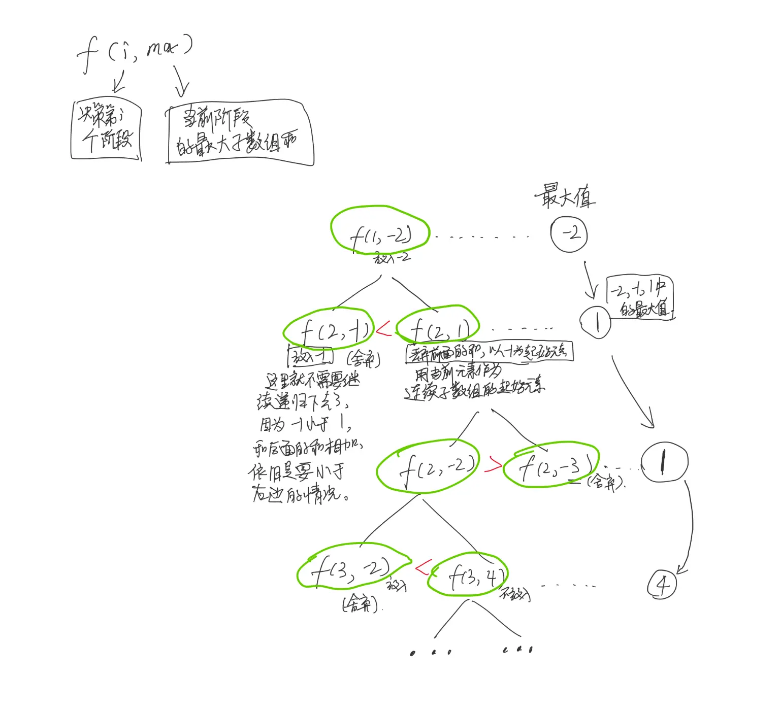 (i, sum)。i 代表 第 i 个阶段的决策,具体做的决策是:是选择当前的元素为新的子数组的起点,还是让当前元素作为原来子数组的后继数组元素。具体逻辑如下图: