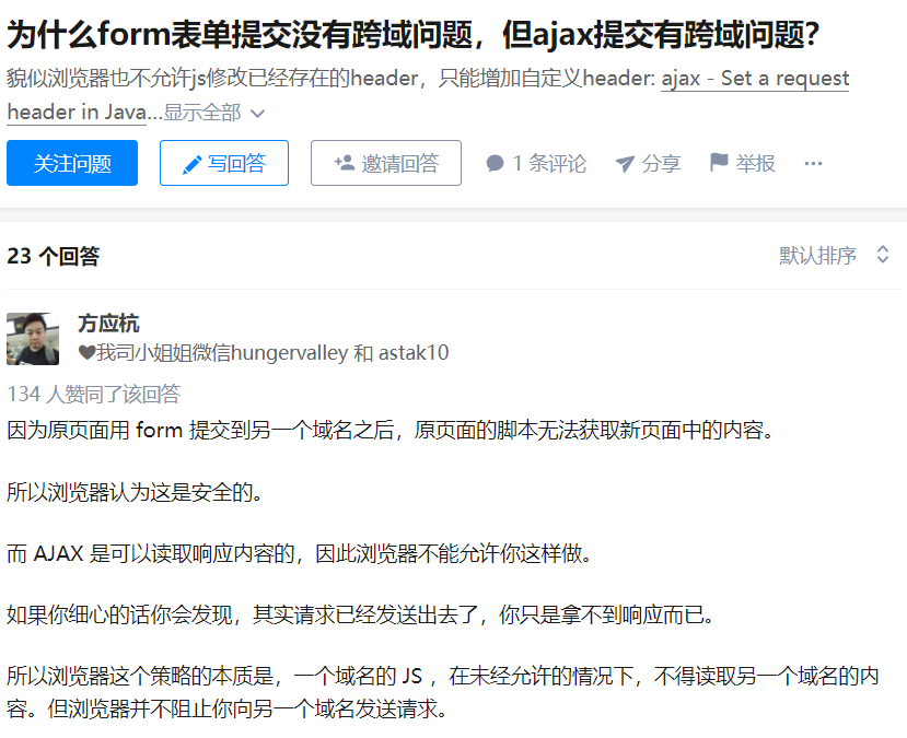 form表单最大的问题就是会刷新页面或打开新的页面,不过form表单却有一个特性即:没有跨域的问题。在上面的程序中,我们如果将form标签变为<form action="http://www.baidu.com/pay" method="get">。实际上这个请求是可以发送的。在知乎上有一个问题:为什么form表单提交没有跨域问题,但是ajax提交有跨域问题?我在这里面借用下方老师的答案 :-)