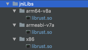 然后把 so 库替换到 Android 项目的 jniLibs 具体文件夹就好了。这样就完成了用 rust 编译 Android 平台的 so 动态库,并且每次编译后的时候就要进行 so 的替换,当然也可以想办法把 rust so 的编译放在 Android gradle 的编译过程中,就和用 CMake 编译一样。
