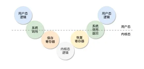 这个过程就是这样的,用户态-》系统调用-》保存寄存器-》内核态执行系统调用-》恢复寄存器-》返回用户态 接着运行