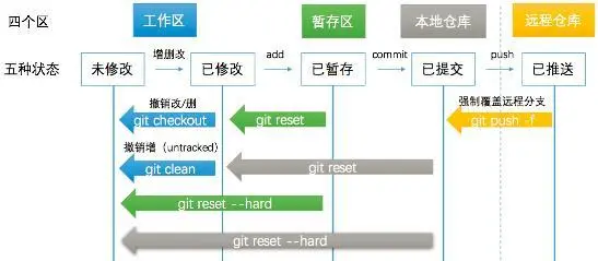 这是Git,独特之处和优势之处,也是很多初学者迷惑指出,尤其拿之前使用SVN的人无法理解的。Git的四个区(工作区、暂存区、本地仓库区和远程仓库区),五个状态转化流程如下: