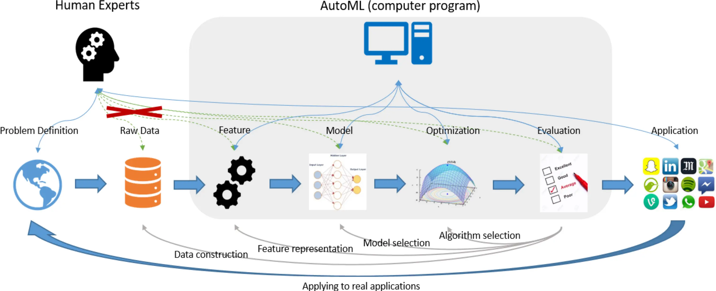也就是说,在这链条中,我们所做的每一次操作,都可以通过评估这一步来检验这次操作。以特征工程为例,假设我们想在已有特征的基础上尝试某个新的特征,那么可以在加了新特征以后,通过评估这一步骤来检验这次操作是否是好的操作。如果我们还希望给AutoML一些反馈,告诉它这次操作是好是坏,那么接下来AutoML就能知道我们之后可能需要的一些其他操作,什么样的操作是较好的操作,或什么样的操作是差的操作。