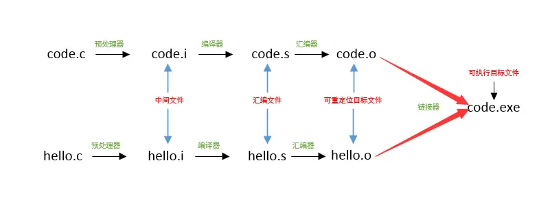 “源文件->可执行目标文件”的过程是由编译驱动程序负责的。以C语言为例,编写两个源文件code.c,hello.c: