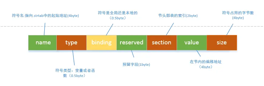 .symtab节被称为符号表,是一个存储着目标文件中所有符号的数组;每个元素对应一个符号的信息。下面看看符号表中元素的数据结构: