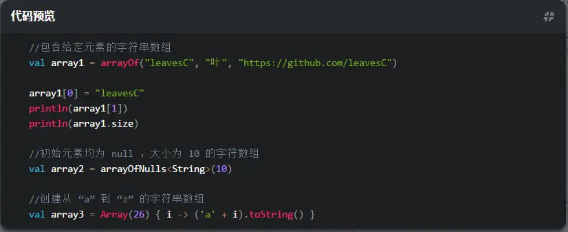 用 arrayOfNulls 创建一个给定大小的数组,包含的元素均为 null,只能用来创建包含元素类型可空的数组