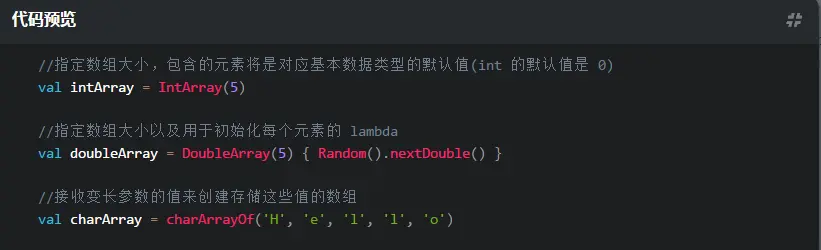 向对应类型的类(如 IntArray)的构造函数传递数组大小,这将返回一个使用对应基本数据类型默认值初始化好的数组