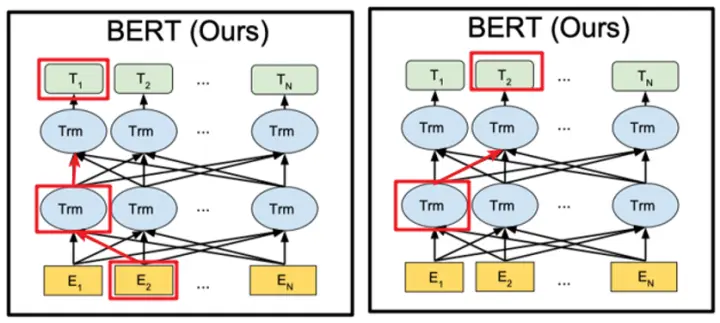 不严谨地解释下:(左图)在预测 T1 的时候,transformer 模块(红框所示)已经将 T2 的信息编码进去了,所以(右图)在预测 T2 的时候,transformer 模块里,已经包含了 T2 的信息,也就是 Jacob 说的 『see themselves』。