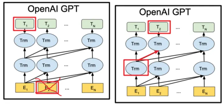 依然不严谨地解释下:(左图)GPT 在预测 T1 时,用不到下文——也就是 T2 向后的信息的,所以 T2 的信息就不会被编码进第一个 transformer 模块(红框所示),所以(右图)在预测 T2 时,不用担心上一层相应模块开启上帝视角。