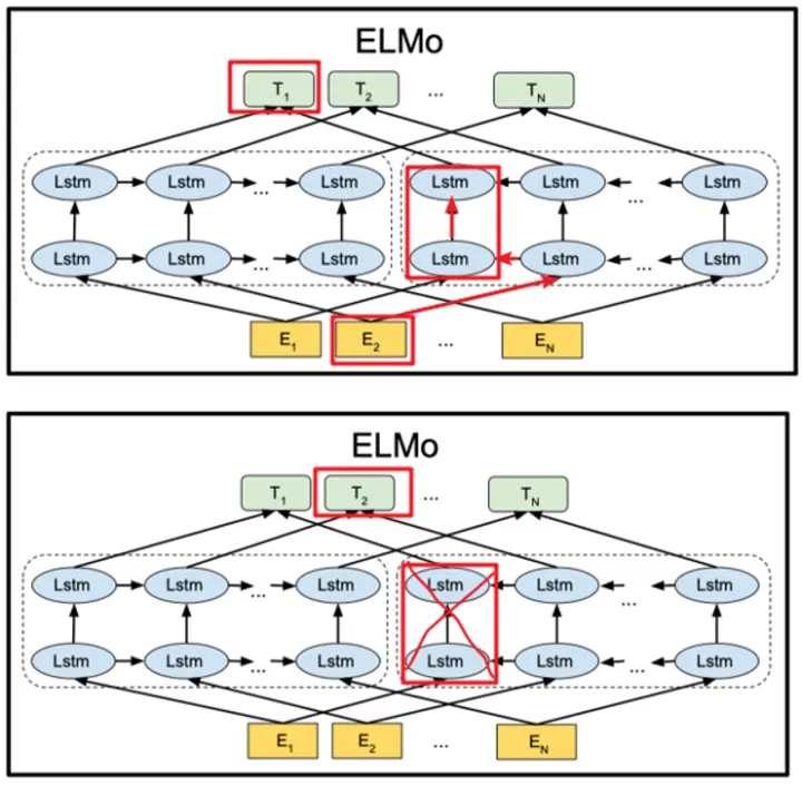 依然不严谨地解释: (上图)在预测 T1 的时候,T2 会被编码到反向语言模型的 lstm 模块里(红框所示),但并不会影响正向的语言模型,(下图)在预测 T2 时,在反向语言模型看来, T1 是 T2 的下文,所以对应的 lstm 模块并不会作用到 T2 上。