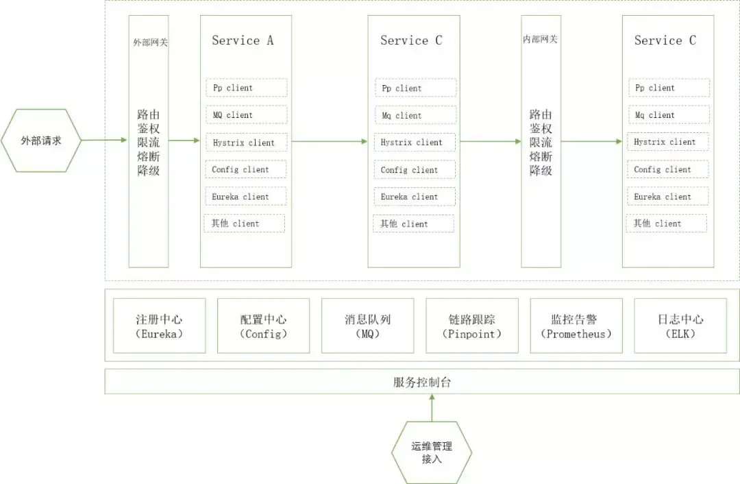 服务网关涵盖的功能包括路由,鉴权,限流,熔断,降级等对入站请求的统一拦截处理。具体可以进一步划分为外部网关(面向互联网)和内部网关(面向服务内部管理)。