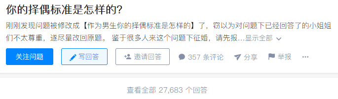 首先,我们要拿到这些小姐姐们的数据,小Z找到了择偶/相亲相关内容下最热门的一个问题——你的择偶标准是怎样的?
