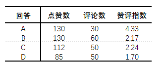 回答A有130个赞,30条评论,回答B有130个赞,60条评论,点赞数相同的情况下,B的评论更多,竞争更加激烈,从竞争的角度看,选择A更加明智; 回答C和D分别有50条评论,而C的点赞数要高于D,在评论数相同的情况下(竞争激烈程度相近),我们应该选择更受青睐的C。