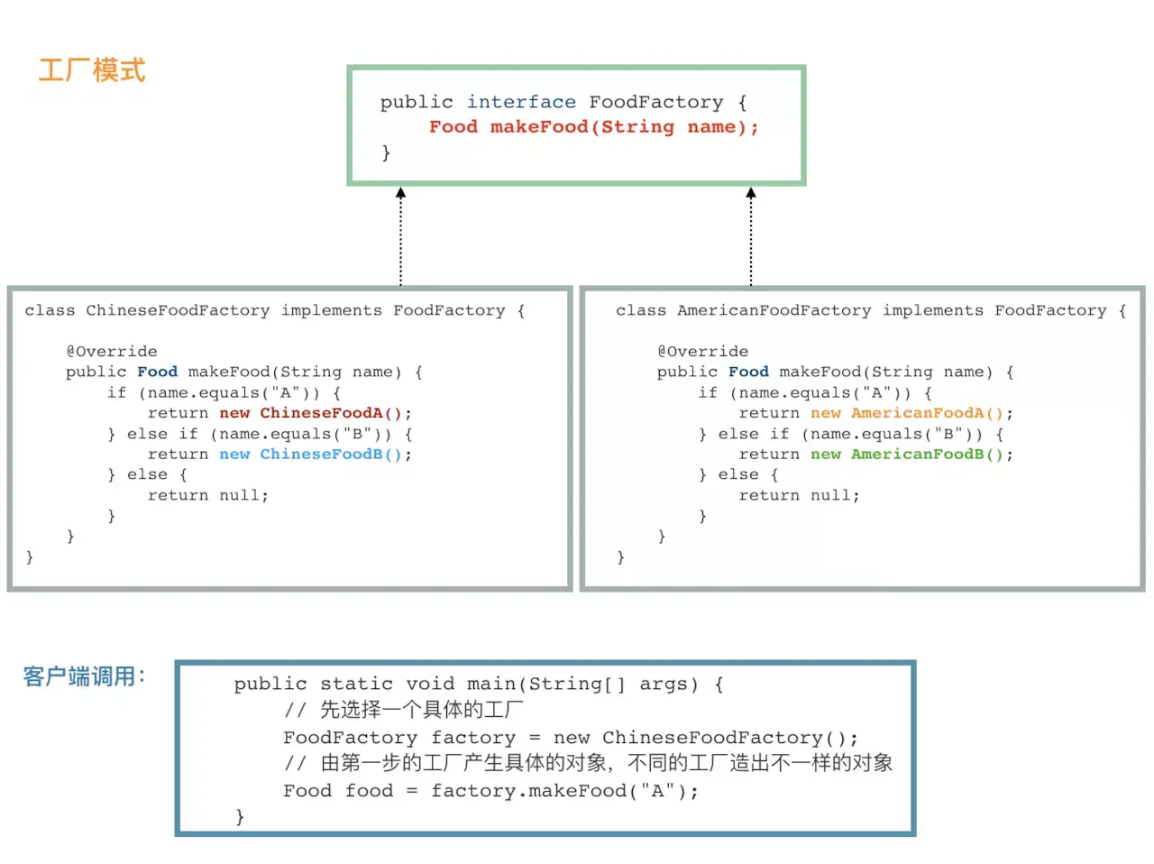 虽然都是调用 makeFood("A") 制作 A 类食物,但是,不同的工厂生产出来的完全不一样。