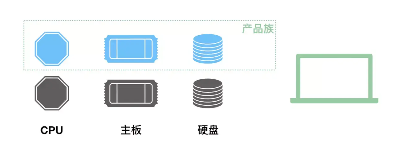 - 当涉及到这种产品族的问题的时候,就需要抽象工厂模式来支持了。我们不再定义 CPU 工厂、主板工厂、硬盘工厂、显示屏工厂等等,我们直接定义电脑工厂,每个电脑工厂负责生产所有的设备,这样能保证肯定不存在兼容问题。