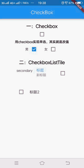 CheckBox 勾选框,继承于 StatefulWidget, 所以本身他是没有状态的 Widget ,一般都是在 父 控件中加入有状态的控件来给他设置。