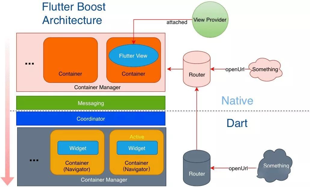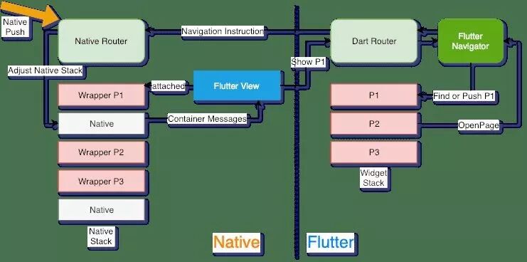 那么在 FlutterBoost 的概念里说到页面的时候,我们指的是 Native 容器和它所附属的 Widget 。所有页面路由操作,打开或者关闭页面,实际上都是对 Native 页面容器的直接操作。无论路由请求来自何方,最终都会转发给 Native 去实现路由操作。这也是接入 FlutterBoost 的时候需要实现 Platform 协议的原因。