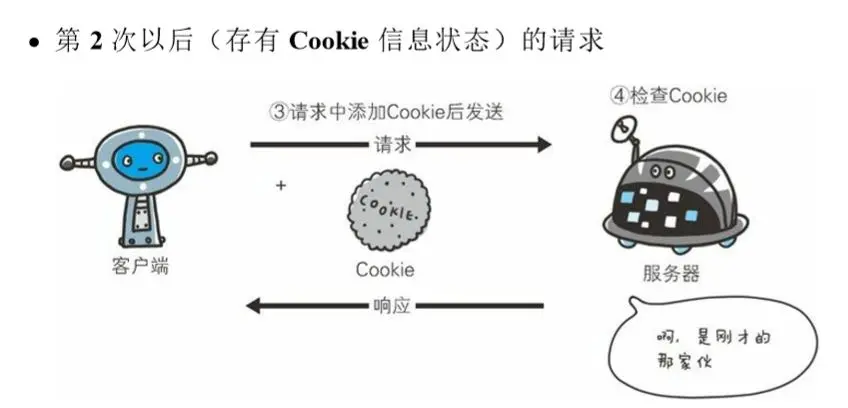 Cookie 会根据从服务器端发送的响应报文内的一个叫做 Set-Cookie 的首部字段信息,通知客户端保存Cookie。当下次客户端再往该服务器发送请求时,客户端会自动在请求报文中加入 Cookie 值后发送出 去。服务器端发现客户端发送过来的 Cookie 后,会去检查究竟是从哪一 个客户端发来的连接请求,然后对比服务器上的记录,最后得到之前 的状态信息。