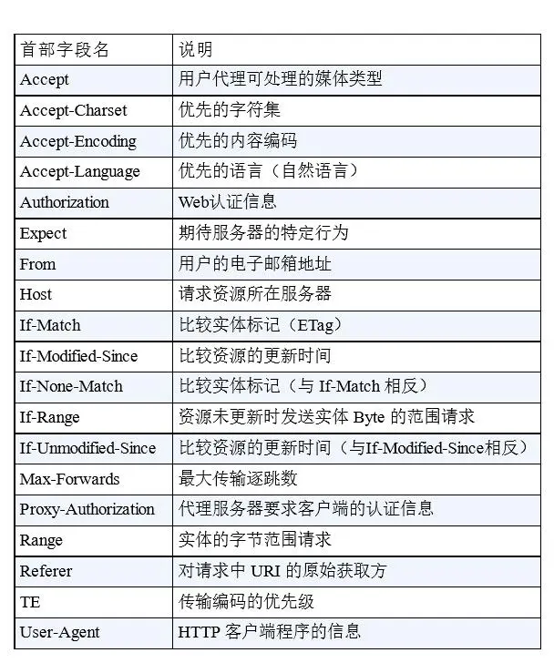 - 请求首部字段:从客户端向服务器端发送请求报文时使用的首部。补充了请求的附加内容、客户端信息、响应内容相关优先级等信息。