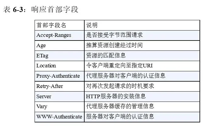 - 响应首部字段:从服务器端向客户端返回响应报文时使用的首部。补充了响应的附加内容,也会为客户端附加额外的内容信息
