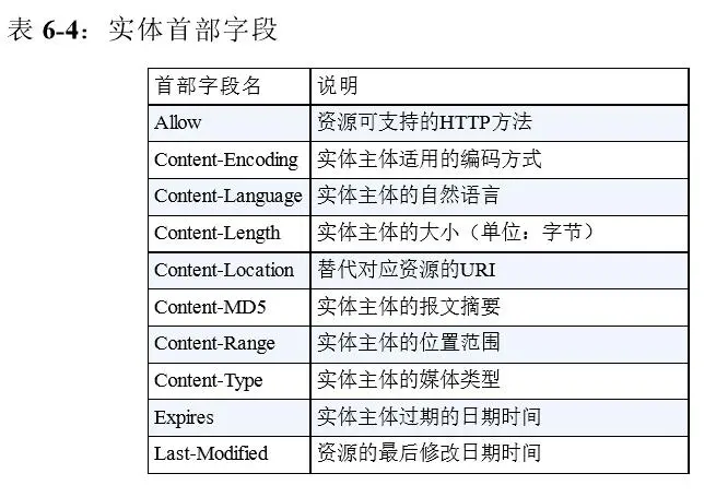- 实体首部字段:针对请求报文和响应报文的实体部分使用的首部。补充了资源内容的更新时间等与实体有关的信息