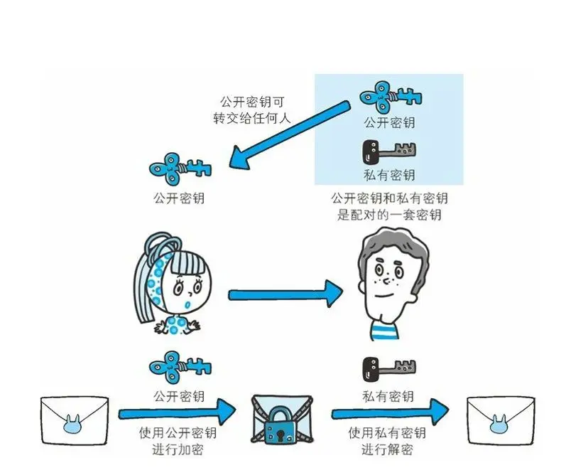 公开密钥加密使用一对非对称的密钥。一把叫做私有密钥 (private key),另一把叫做公开密钥(public key)。顾名思 义,私有密钥不能让其他任何人知道,而公开密钥则可以随意发 布,任何人都可以获得。