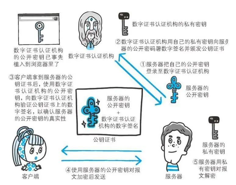 服务器会将这份由数字证书认证机构颁发的公钥证书发送给客户端, 以进行公开密钥加密方式通信。