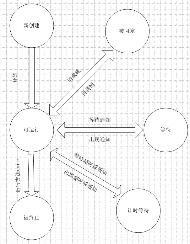 - 试图获得一个内部对象锁(非JUC库中的锁), 而该锁被其他线程持有, 进入阻塞状态. 当所有其他线程释放该锁, 且调度器允许该线程持有此锁, 进入可运行状态.