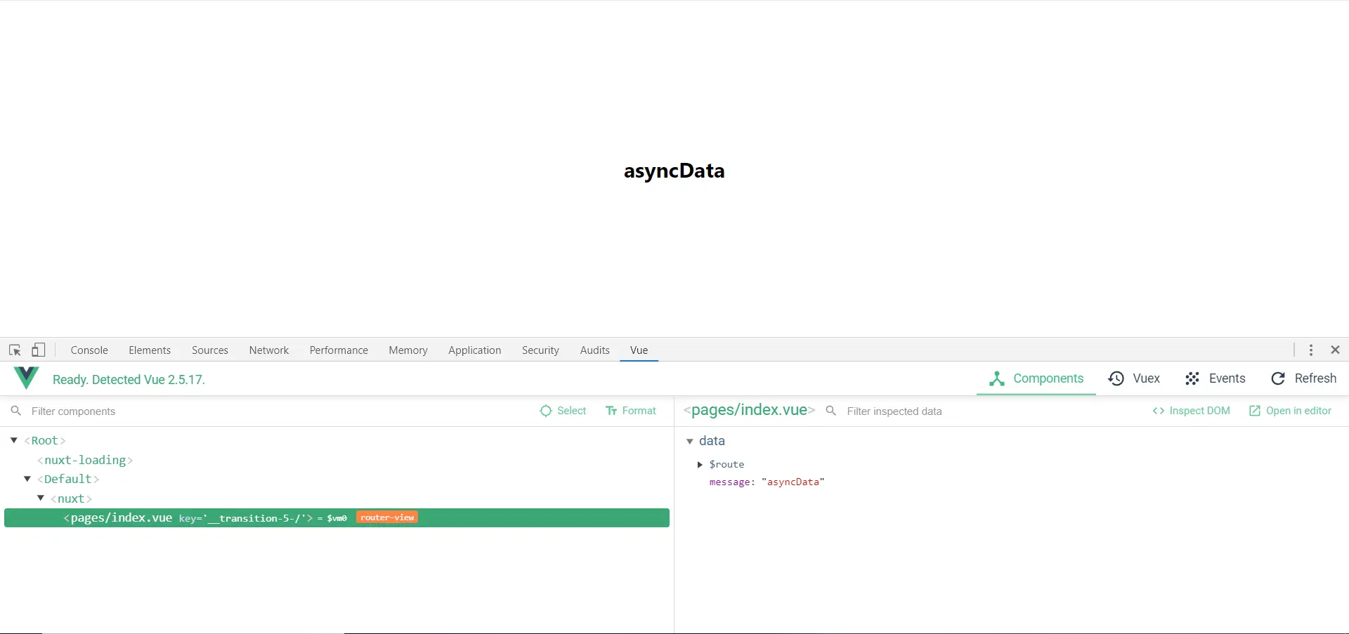 - asyncData方法会在组件(限于页面组件)每次加载之前被调用。它可以在服务端或路由更新之前被调用。在这个方法被调用的时候,第一个参数被设定为当前页面的上下文对象,你可以利用 asyncData方法来获取数据并返回给当前组件。