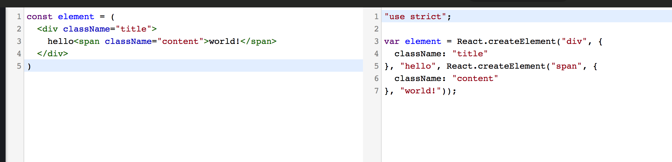 我们平时在react中写的JSX,其实是一种语法糖,会被babel转换成React.createElement()。我们可以在babel官网上做个实验,看下JSX会被babel转换成什么。下面是个简单的例子。