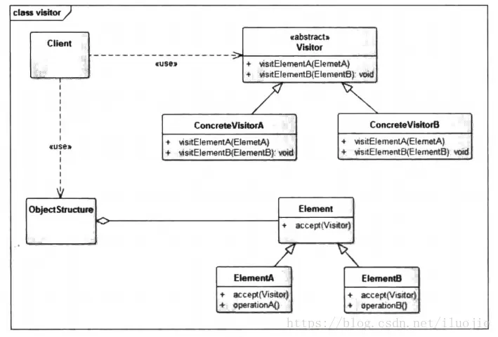 - ObjectStructure:对象结构,通常包含多个被访问的对象,让访问者访问他的元素。