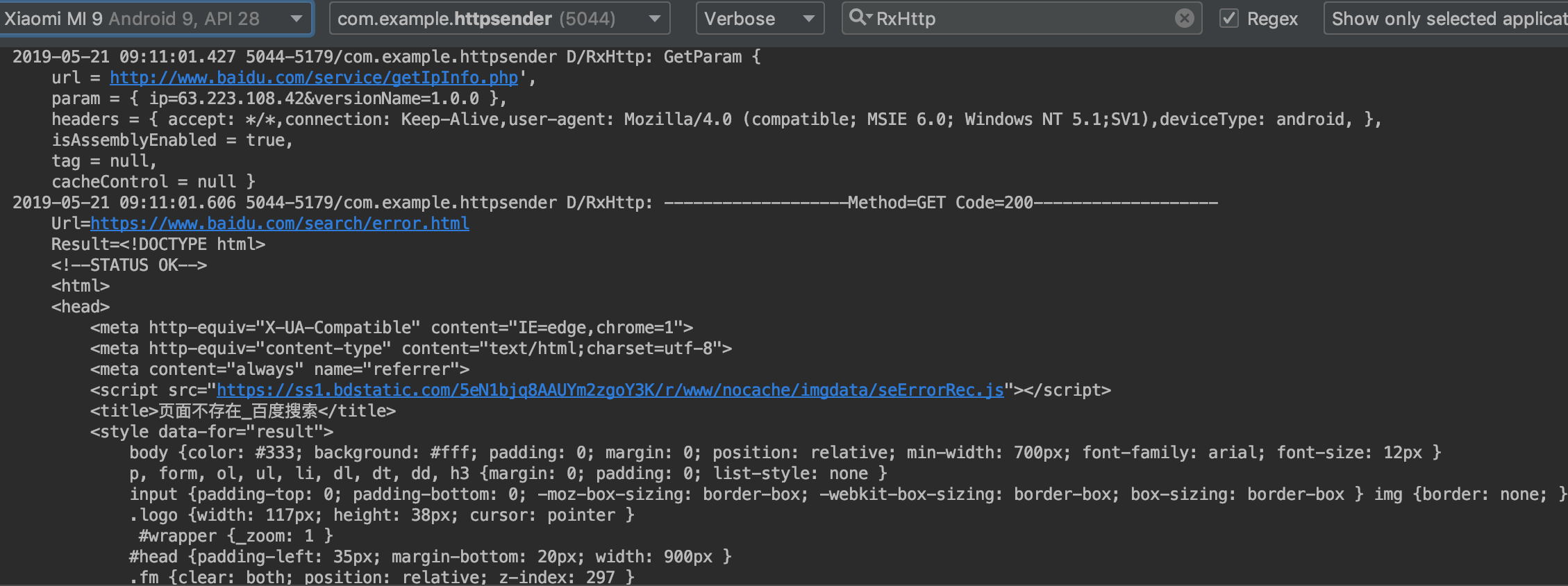 此时,发送请求前,RxHttp会对我们传入url做判断,如果url里已经有baseUrl,即是一条完成url链接,就不会添加@DefaultDomain注解表明的baseUrl,否则就会添加,我们通过日志来观察以下结果(过滤RxHttp)