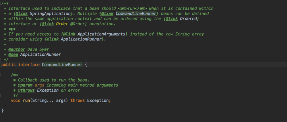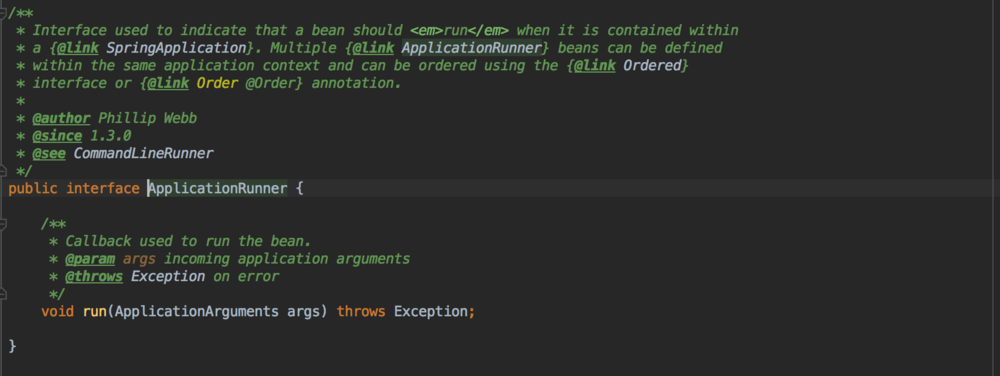 接口被用作将其加入spring容器中时执行其run方法。多个CommandLineRunner可以被同时执行在同一个spring上下文中并且执行顺序是以order注解的参数顺序一致。