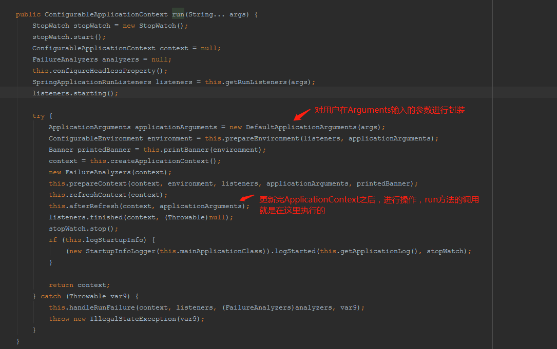 用户只要实现这两个接口,其中的run方法就会在项目启动时候被自动调用,那么究竟是在什么时候调用的呢?下面可以看一下Application的启动流程