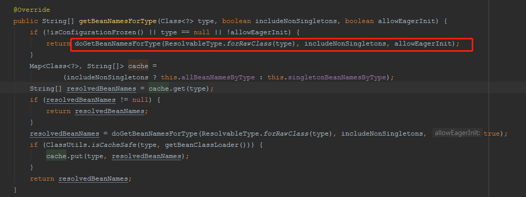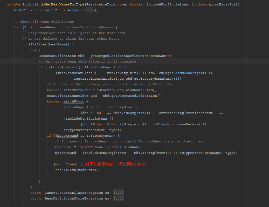 跟踪context.getBeansOfType()方法,具体实现在类DefaultListableBeanFactory中