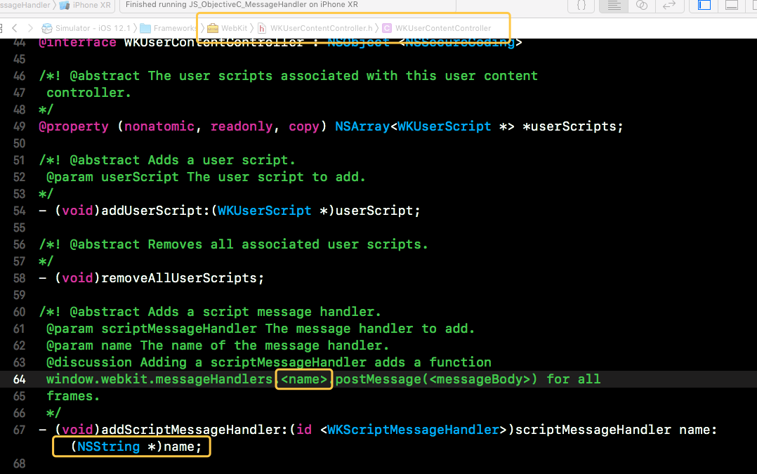 WKWebView 初始化时,有一个参数叫configuration,它是WKWebViewConfiguration类型的参数,而WKWebViewConfiguration有一个属性叫userContentController,它又是WKUserContentController类型的参数。WKUserContentController对象有一个方法- addScriptMessageHandler:name:,我把这个功能简称为MessageHandler。- addScriptMessageHandler:name:有两个参数,第一个参数是userContentController的代理对象,第二个参数是JS里发送postMessage的对象。