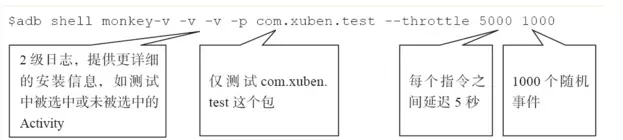 如果不指定options,Monkey将以无反馈模式启动,并把事件任意发送到安装在目标环境中的全部包。下面是一个更为典型的命令行示例,它启动指定的应用程序,并向其发送500个伪随机事件。