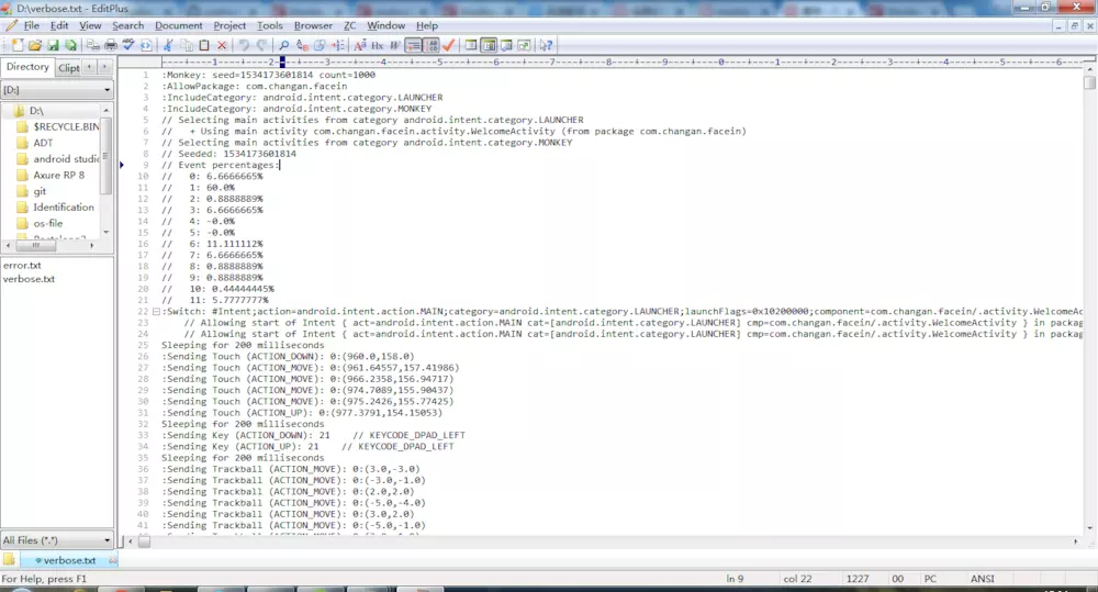 | verbose.txt | 记录了MONKEY测试时发送的各种事件,如触摸事件的位置等等 |