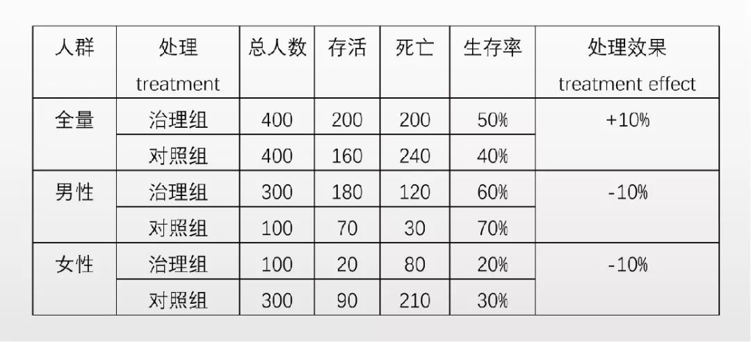 有一个很有名的例子,叫做 Yule-Simpson’s Paradox。有文献称,Karl Pearson 很早就发现了这个悖论——也许这正是他反对统计因果推断的原因。此悖论表明,存在如下的可能性:X和Y在边缘上正相关(处理效果为正),但是给定另外一个变量Z后,在Z的每一个取值上,X和Y都负相关。下表是一个数值的例子,处理对整个人群有 “正作用”,奇怪的是,处理对男性有 “负作用”,对女性也有 “负作用”。一个处理对男性和女性都有 “负作用”,但是他对整个人群却有 “正作用”:悖论产生了!