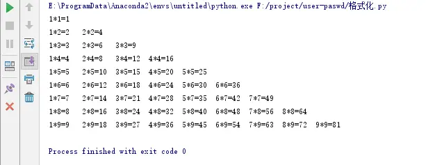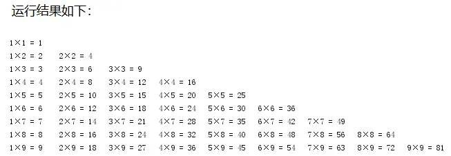 print("\n".join("\t".join(["%s*%s=%s" % (y, x, x * y) for y in range(1, x + 1)]) for x in range(1, 10)))运行结果: