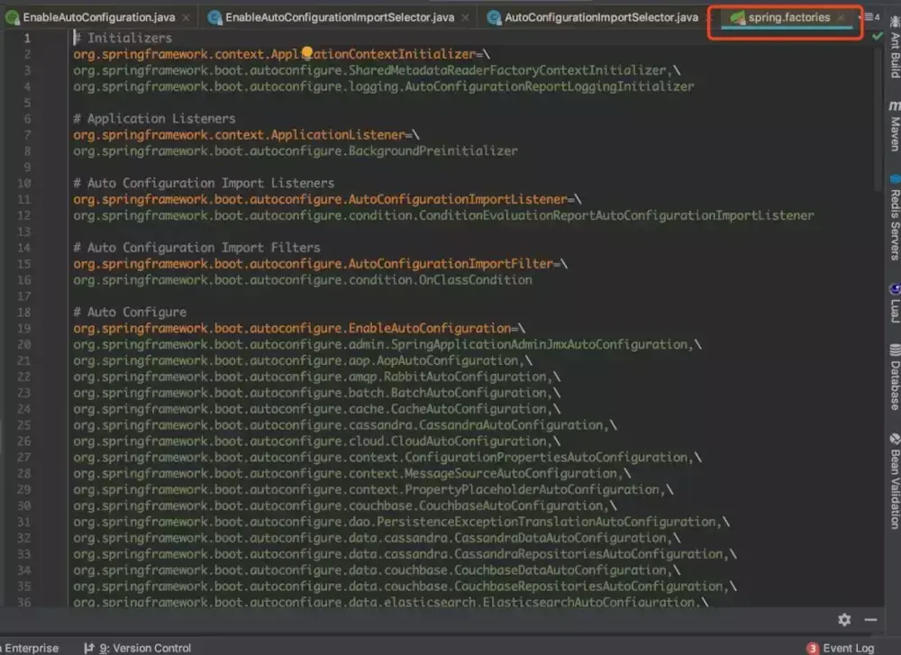 这个类会帮你扫描那些类自动去添加到程序当中。我们可以看到getCandidateConfigurations()这个方法,他的作用就是引入系统已经加载好的一些类,到底是那些类呢,我们点进去看一下
