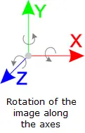 设置隐藏窗口后,继续选项不活动,以离开旋转角度对话框在顶部。角度的正值使图像沿指定轴逆时针旋转。轴向和旋转方向如下图所示: