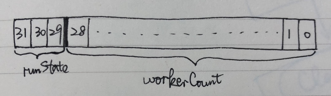 线程池用一个32位的int来同时保存runState和workerCount,其中高3位(第31到29位)是runState,其余29位是workerCount(大约500 million)。