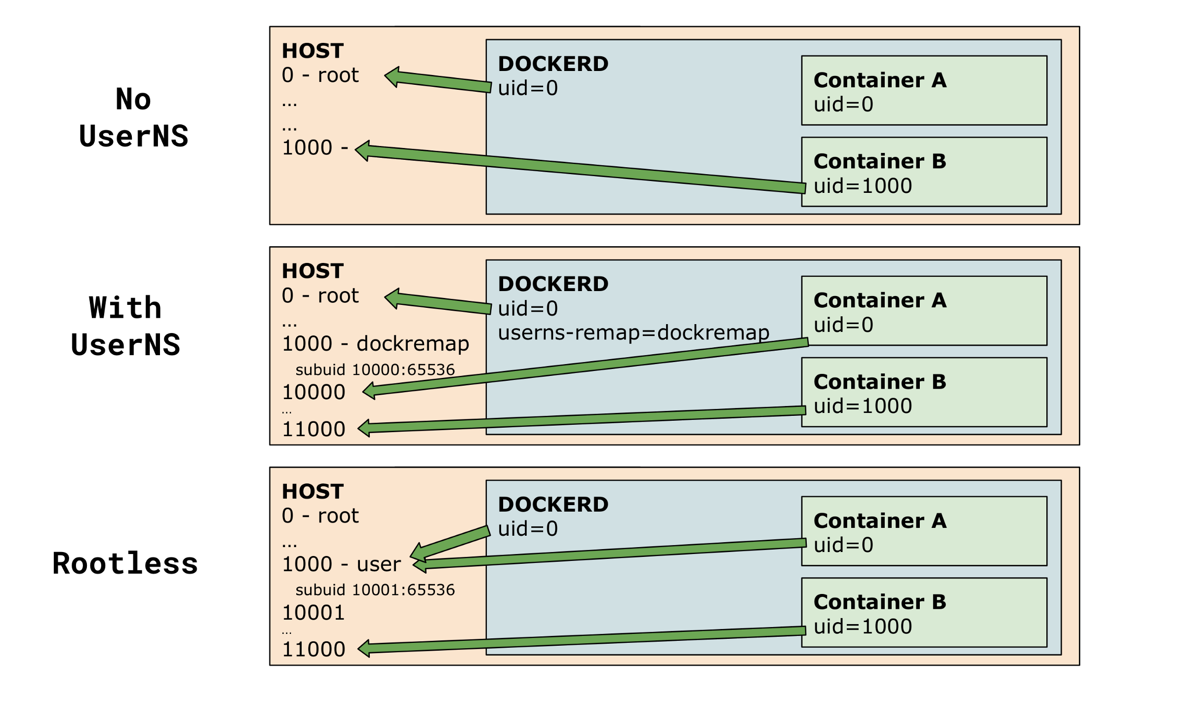 首先是利用 user namespaces 将容器中的root用户uid/gid映射到宿主机的非特权用户范围内。Docker Engine已经提供了 --userns-remap 标志支持了相关能力,提升了容器的安全隔离性。Rootless容器在此之上,让Docker daemon也运行在重映射的用户名空间中。