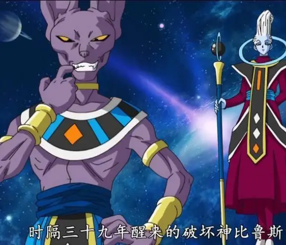 长耳朵的紫色斯芬克斯猫是破坏神比鲁斯,破坏神是界王神的反面,拥有当前宇宙最强的力量,以破坏星球为乐。而拿着权杖的是天使,既是破坏神比鲁斯的师傅也是其侍从。他俩在破坏地球的过程中被地球的美食所吸引,逐渐成为了孙悟空和贝吉塔的师傅,人设也从最初的邪恶之力逐渐逗逼化。并且有沦为布玛家保姆的趋势。