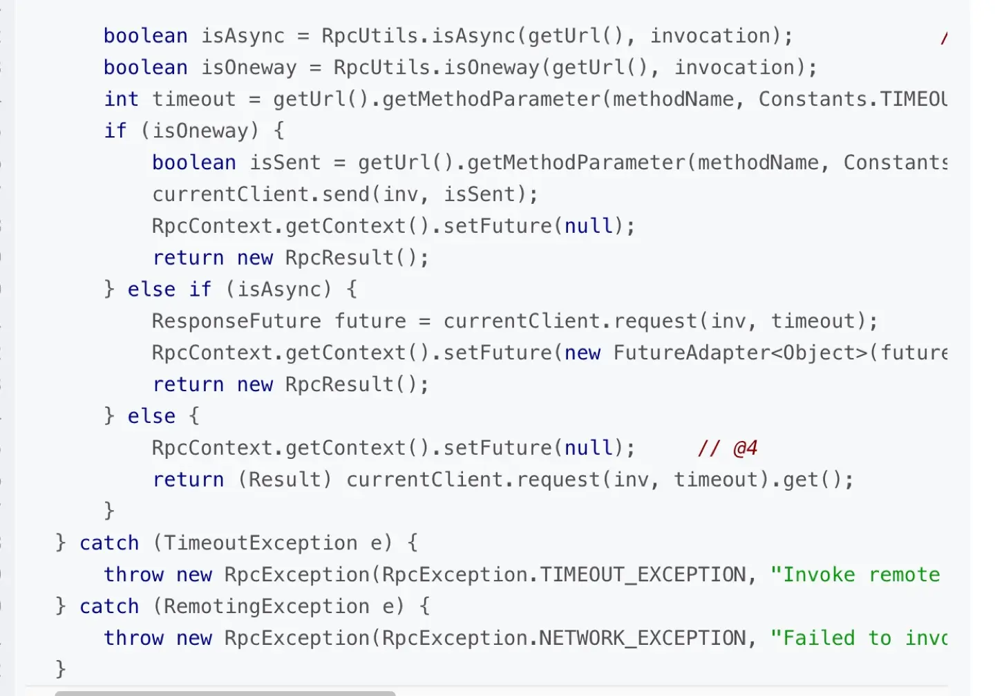 在java环境下,Stub可以直接作为一个工具类,让客户端像调用本地方法一样调用远程方法,我们可以根据服务端提供的的接口描述,通过java动态代理或者字节码工具生成这个接口的一个实现类,在这个实现类里通过Stub去 调用远程,将参数序列化和接口地址通过网络发给服务端,并将返回结果的二进制数据反序列化为返回的对象,那么Stub作为一个工具类,处理网络连接,失败重试,序列化和反序列化等,而动态生成的代理类都依赖该工具,客户端实际用到的是这个代理类, 另外我们可以思考下,怎么实现客户端的异步调用以及回调,异步调用是指,客户端代理类将调用请求通过stub发给服务端后不等待服务端的结果,可以直接继续后面的流程,或者也可以等到服务端返回后执行一个回调. 这里我们可以参考dubbo的做法,将通过网络发送请求的过程封装在一个Future对象里,如果是同步调用就直接调用future.get等待结果,如果是异步调用就直接将future对象放入一个threadlocal对象RpcContext里就返回,如果需要执行异步回调,就监听这个future对象返回后执行注册的通知程序