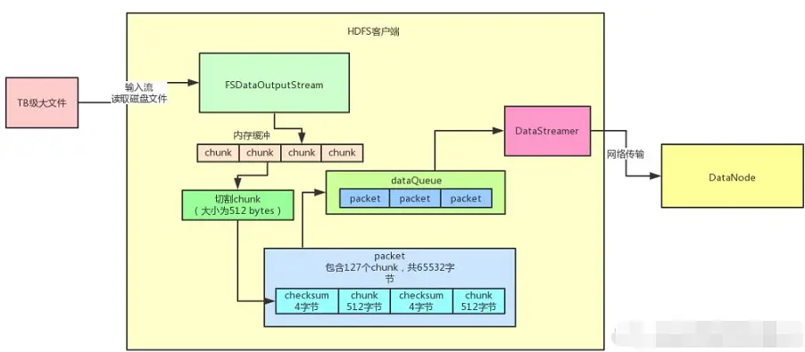 所以大家观察上面那个图,hdfs客户端可以快速的将tb级大文件的数据读出来,然后快速的交给hdfs的输出流写入内存,基于内存里的chunk缓冲机制、packet数据包机制、内存队列异步发送机制,绝对不会有任何网络传输的卡顿,导致大文件的上传速度变慢。反而通过上述几种机制,可以大幅度提升一个TB级大文件的上传性能。