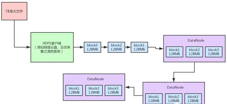 这个HDFS客户端你可以理解为是云盘系统、日志采集系统之类的东西,比如有人上传一个1TB的大文件到网盘,或者是上传个1TB的大日志文件。
