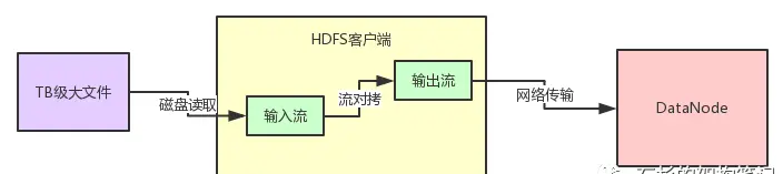 参见上图,对文件的输入流最多就是个FileInputStream,对DataNode的输出流,最多就是个Socket返回的OutputStream,然后中间找一个小的内存byte[]数组,进行流对考就行了。从本地文件读一点数据,就给DataNode发一点数据。